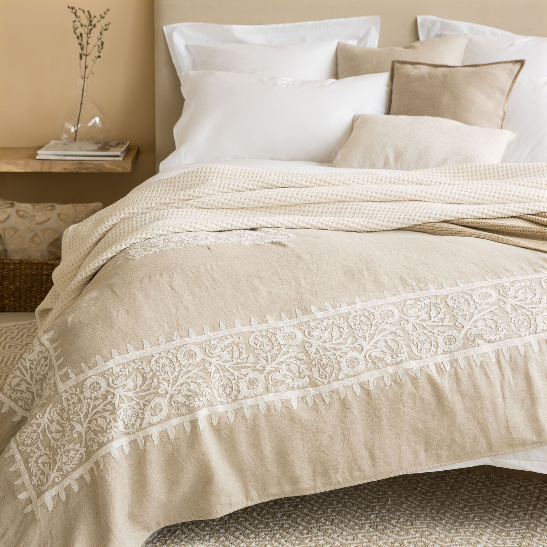 También tengo en la cabeza comprar una colcha para la cama. Creo que voy a huir de las fundas nórdicas, no me gusta que las sábanas que lavo tan a menudo sean la capa experior de la cama. Primero, porque si no las plancho, no veo la habitación ordenada y la cama no parece estar limpia auqnue las acabe de poner, y segundo porque parece que la decoración de mi habitación cambia cada vez que cambio el juego de sábanas. He echado un vistazo a las colchas de Zara home y esta en concreto (